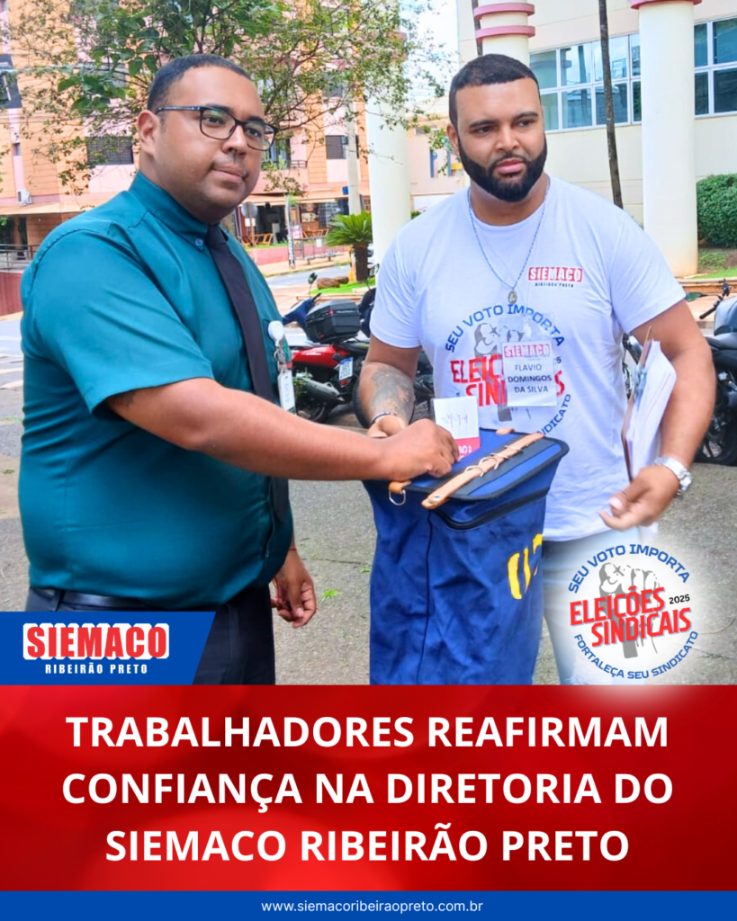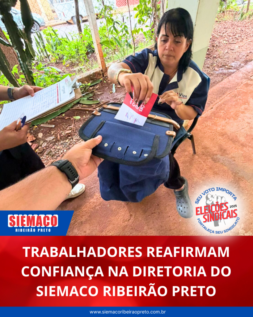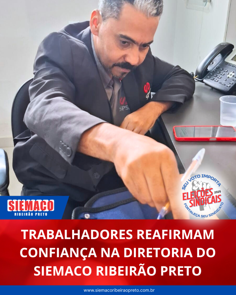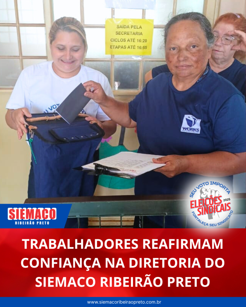 Na última semana, o SIEMACO Ribeirão Preto realizou sua eleição sindical, marcada pela expressiva participação dos trabalhadores e trabalhadoras associados. A presença ativa da categoria reforça a importância da democracia sindical e do envolvimento coletivo nas decisões que impactam o dia a dia da classe trabalhadora.
